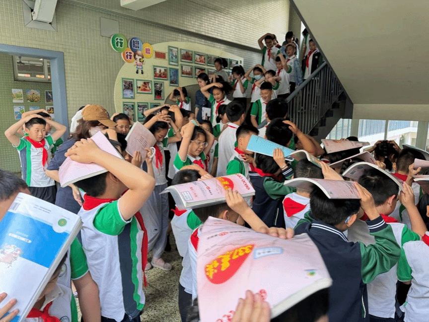 之后,在理论学习的基础上,学校组织全校小学生进行了防震减灾疏散演练。当急促的警报声响彻校园,安全员老师迅速镇定地下达指令:“地震发生,大家立刻寻找安全地方躲避!”孩子们立刻应用所学的避灾知识进行迅速反应,有的双手护住头部钻入钢制的课桌下方,有的蜷缩成"生命三角"防护姿态。稍后,各班立即按预案有序高效地进行疏散撤离。仅过了 2 分 15 秒,全体师生就在操场完成集结,体现出防震防灾安全教育的明显成效。